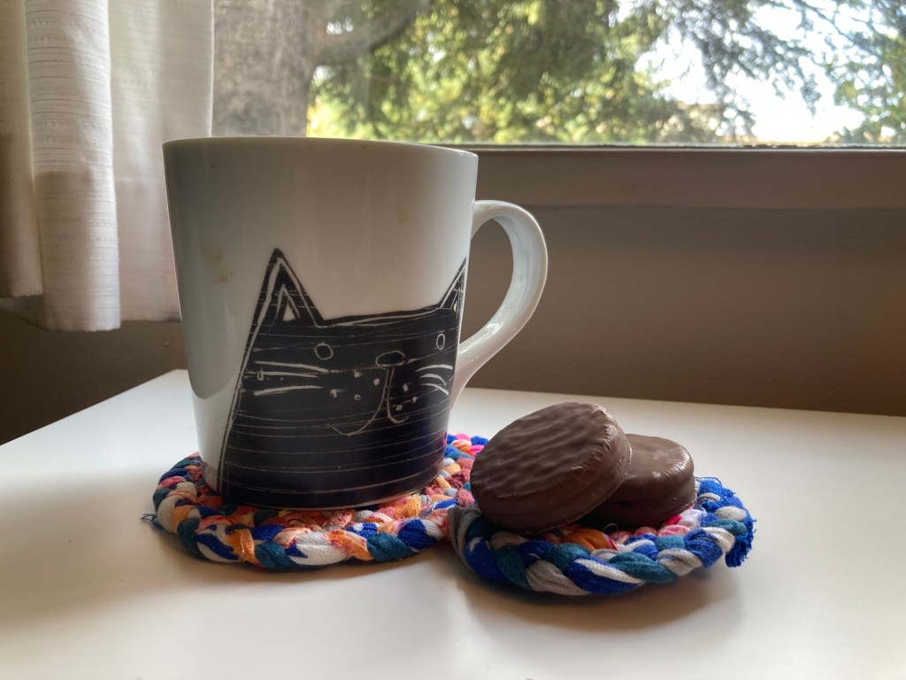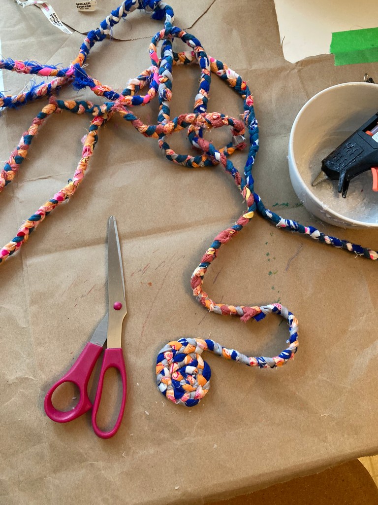 This Mug Rug Tutorial gives you an idea, but I don’t sew the fabric coil together. I use a hot glue gun. Even more fun, imo!