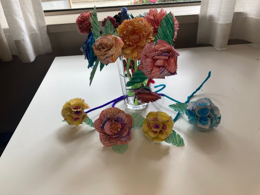 And of course, there is no better way to destress then scribbling on some recycling from the bin and making a fun paper flower. I’ve linked here to the Scrappy Flower Fun Craft Page.