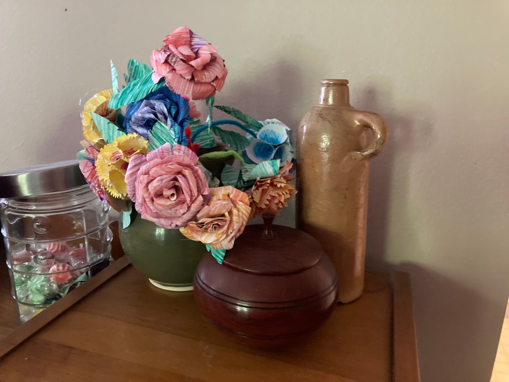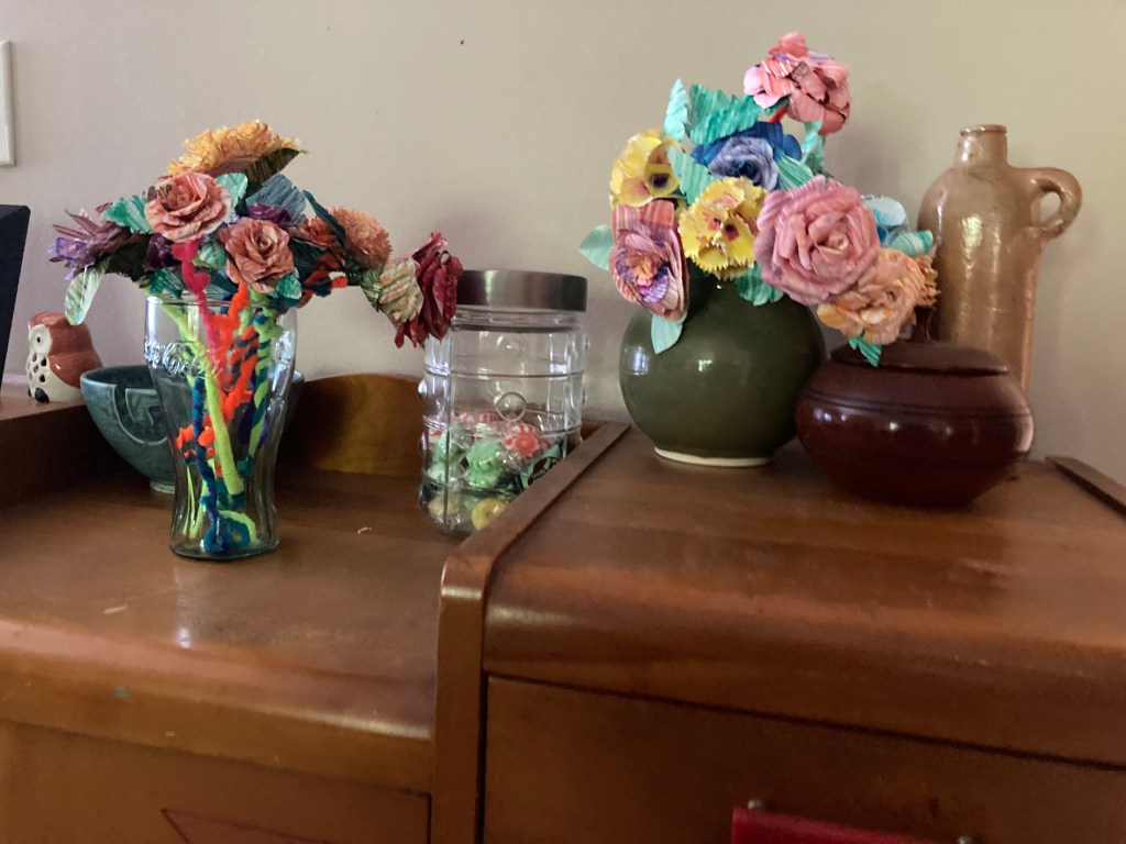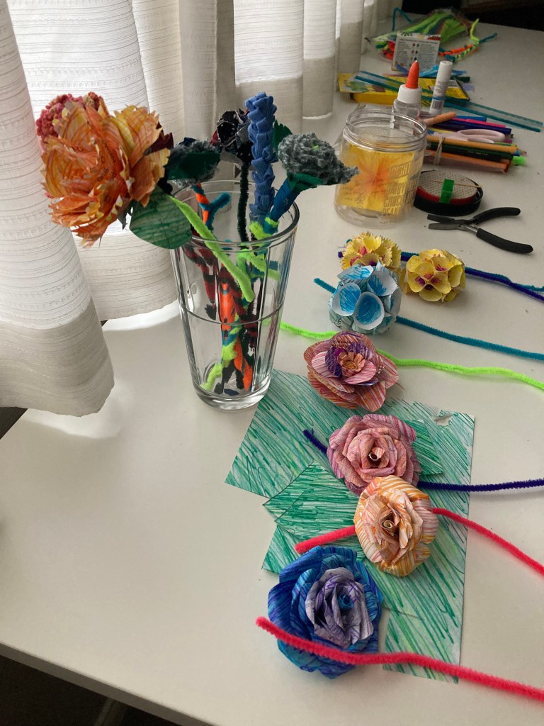 There’s no excuse not try a scrappy flower craft right now! Grab some paper from the recycling bin, scribble on it with pens or markers and give paper flower making a shot. Or visit your local dollar store to pick up some supplies and spend the afternoon having a fun, and much needed, Mental Health Craft Break.